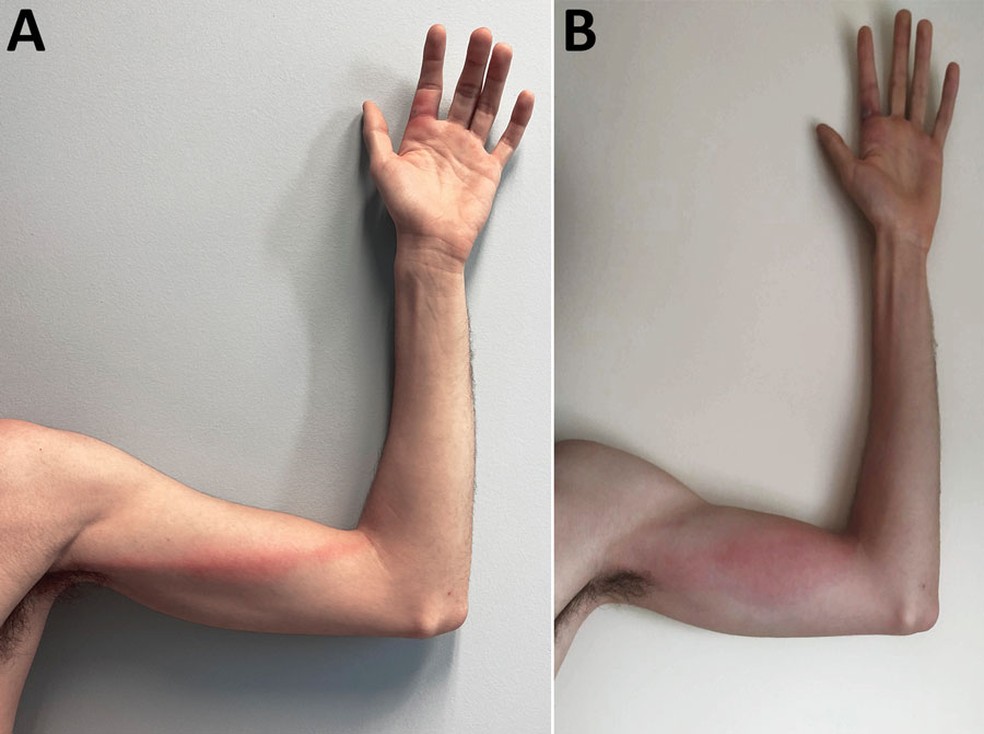 | Paciente com uma inflamação dos vasos linfáticos causa pela mpox. — Foto: CDC |